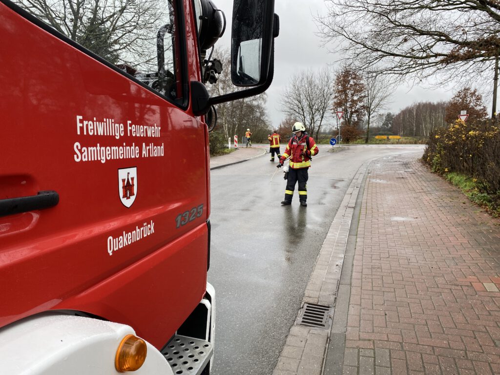 Adventskranz in Brand geraten Am Heiligabend wurden wir zusammen mit der Feuerwehr Nortrup  und der Feuerwehr Badbergen zu einem gemeldeten Gebäudebrand alarmiert. Gegen 10:20 Uhr geriet aus ungeklärter Ursache ein Adventskranz mit ca. 1 Meter Durchmesser in einem Gewerbebetrieb an der Friedrichstraße in Brand. Der Kranz konnte durch einen Trupp unter schweren Atemschutz mit einem Kleinlöschgerät rechtzeitig abgelöscht werden somit eine Ausbreitung verhindert werden. Wegen der starken Rauchentwicklung wurde das Gebäude anschließend mit zwei Hochleistungslüftern belüftet und mit der Wärmebildkamera wurde der Deckenbereich, wo der Kranz gehangen hatte, auf verstecke Hitzeentwicklung zu kontrolliert. Die vorsorglich mitalarmierten Feuerwehren aus Nortrup und Badbergen, die sich nach Eintreffen auf dem Parkplatz eines benachbarten Einkauf-Centers bereitgestellt hatten, mussten glücklicherweise nicht mehr eingesetzt werden. Die Polizei hat die Ermittlungen zur Brandursache aufgenommen.   Während der Rückfahrt zum Feuerwehrhaus, wurde von uns dann noch eine längere Dieselspur die sich über die Artlandstraße, Friedrichstraße, Menslager Straße und der Mimmelager Straße verteilt hatte, abgebunden.     Text und Foto: Jens Ludmann, FFQ