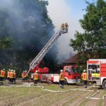 Mit der Meldung „Verdächtiger Rauch“ wurden wir am Sonntag Nachmittag um 16:10Uhr alarmiert. Bereits auf der Anfahrt zum Feuerwehrgerätehaus war eine schwarze Rauchsäule am Stadtrand Richtung Bevern am Himmel zu erkennen. Sofort wurden vom Einsatzleiter die Feuerwehren aus Freiwillige Feuerwehr Badbergen, Freiwillige Feuerwehr Nortrup, Wehdel und Grönloh mit Vollalarm nachgefordert. Ein unbewohntes, landwirtschaftliches Anwesen mit einer Scheune stand aus bislang ungeklärter Ursache in Vollbrand. Mehrere Trupps unter schwerem Atemschutz versuchten das Feuer unter Kontrolle zu bringen. Auch die Drehleiter der Feuerwehr Nortrup wurde in Stellung gebracht, um das Feuer von oben zu bekämpfen. Ein Innenangriff war aufgrund von herabstürzenden Teilen des Dachstuhls nicht möglich. Neben der Brandbekämpfung machte den Einsatzkräften auch die extreme Hitze zu schaffen. Da die nächste Wasserentnahmestelle einige hundert Meter entfernt war, wurde ein Pendelverkehr mit Tanklöschfahrzeugen eingerichtet, um die Einsatzstelle mit ausreichend Wasser zu versorgen. Während der Löscharbeiten wurde die Bremer Straße in beiden Richtungen für den Durchgangsverkehr gesperrt. Nach etwa 2,5 Stunden konnten die Einsatzkräfte der anderen Wehren die Einsatzstelle verlassen, während wir Nachlöscharbeiten vorgenommen und einige Glutnester abgelöscht haben. Seit 20.30Uhr konnte dann „Feuer aus“ gemeldet werden. Allerdings sind wir aktuell noch mit den Aufräumarbeiten beschäftigt.