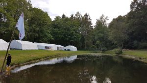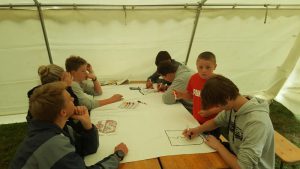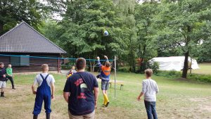 Nach einer eher kühlen Nacht begann der zweite Tag für die Jugendlichen mit einem ausgiebigen Frühstück, welches von den Betreuern und Jugendwarten vorbereitet wurde. Danach hieß es dann „an die Stifte, fertig, los!“ Da es in jedem Zeltlager einen Lagerwimpel gibt, konnten die Jugendlichen ihr künstlerisches und kreatives Geschick unter Beweis stellen und den Wimpel, in Form eines riesen Bettlakens, selbstständig gestalten und anfertigen. Nach dem Mittagessen sollte es dann eigentlich ins Freibad gehen, was aber kurzer Hand wegen der Witterung umdisponiert wurde. Ganz ohne körperliche Betätigung verlief der Nachmittag dann aber nicht. Statt dem Besuch im Freibad wurde ein Volleyballturnier durchgeführt, wo alle Jugendfeuerwehren gegeneinander antreten mussten. Die Ergebnisse der Volleyballpartie fließen am Ende des Lagers zu den Ergebnissen der noch folgenden Wettkämpfe wie z.B. der Stadtrally mit ein, um den Gewinner zu ermitteln. Der am Morgen fertig gestellte Wimpel, auf dem sich alle vier Jugendfeuerwehren verewigt haben, wurde dann an einem langen Mast befestig und nach dem Abendessen gemeinsam mitten im Lager aufgestellt. Gegen 22 Uhr startete die von der JF Nortrup ausgearbeitete Nachtwanderung durch die dunklen Wälder Ankums. Angst hatte von den Jugendlichen zwar niemand, aber eine gewisse Anspannung und Aufregung stand doch jedem einzelnen ins Gesicht geschrieben, nachdem die einen oder anderen Erschrecker plötzlich aus dem Nichts auftauchten. Leicht „durchgegruselt“ und im Lager wieder angekommen hieß es dann für alle: „Zähne putzen, ab in die Zelte und NACHTRUHE“